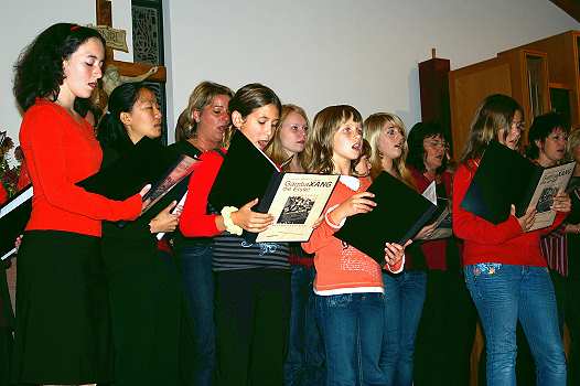 Musikalischer Regenbogen begeisterte (Foto: privat)(bro) (lg) Die Gammelsbacher Kirche war am Freitagabend für mehr als 140 Gäste bestuhlt, und das war gut so. Vor vollem Haus begeisterte die Singgruppe GambaXANG die Gäste mit ihrem Programm "C´est la vie". Die muntere Schar zählt schon kurz nach ihrem ersten Geburtstag 35 singbegeisterte Teilnehmer: Kinder, Teenies, Frauen und Männer sind unter Ronald Autenrieths Leitung mit Spaß und Eifer bei der Sache und präsentierten dem Publikum, was sie in den letzten vier Monaten dazugelernt hatten. Vom Titelsong "C´est la vie" des legendären Travestieduos Mary und Gordy über Schlager, Calypsos bis hin zu dem mitreißenden "I will follow him" aus dem Film "Sister Act" wurde das Leben in seinem Facettenreichtum ausgeleuchtet. Der musikalisch bunte Regenbogen an Liedern wurde ergänzt durch die Gitarren- und Gesangsgruppe desselben Namens, "Regenbogen", aus Michelstadt-Vielbrunn unter der Leitung von Reimund Bechtold. Acht Erwachsene musizierten neue geistliche Lieder in stetig wechselnden Besetzungen. Weibliche und männliche Singstimmen, Trompeten, Gitarren, Bongos und mehr sorgten für Abwechslung. Da die Lieder oft gehaltvolle Texte hatten, kam auch die Nachdenklichkeit nicht zu kurz. Ein irischer Segen vermochte die Hörer ebenso zu verzaubern, wie Ohrenschmeichler des singenden Pfarrers Clemens Bittlinger oder eine visionäre Rede des Indianerhäuptlings Seattle. Einen besonderen Farbtupfer steuerte die Japanerin Nozomi Ijiri mit Klaviermusik aus ihrer Heimat bei. Sie begleitete die Gruppe GambaXANG auch bei der olympischen Hymne "Dream Again", wobei Johanna Löhlein und Christina Bürck als Solistinnen gefielen. Eine besondere Verdichtung erfuhr das Motto "C´est la vie", als Elke Krause zwei Songs aus Leonard Bernsteins "Westside Story" interpretierte. Mit klarer, ausdrucksvoller und dennoch textverständlicher Singstimme traf sie den besonderen Tonfall der stimmungsvollen Musicalnummern und wurde dabei von Ronald Autenrieth einfühlsam und packend am Klavier unterstützt.