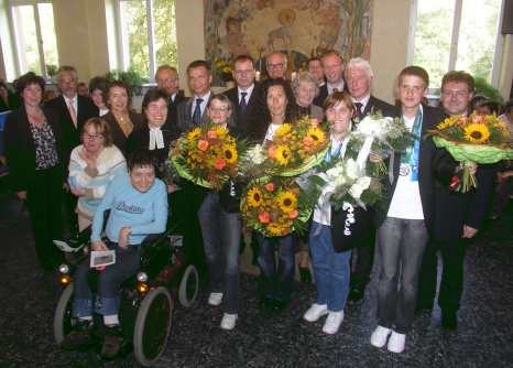 In Shanghai Gold, Silber und Bronze geholt Einen großen Empfang bereiteten die Johannes-Anstalten Mosbach ihren medaillengekrönten Special-Olympics-Teilnehmern (vorne v.re.) Philipp Heilig, Kirstin Weckbach, Coach Claudia Geiger und Elke Jäger. (Foto: Annette Peters)(bro) (ap) Zwei Goldmedaillen, zwei Silber- und zwei Bronzemedaillen. Das ist die beeindruckende sportliche Bilanz von Elke Jäger, Kirstin Weckbach und Philipp Heilig, die am Wochenende von den Special Olympics World Summer Games 2007, den olympischen Weltsommerspielen der Menschen mit geistigen Behinderungen, aus Shanghai zurückgekehrt sind. Am Montag bereiteten ihnen die Johannes-Anstalten Mosbach einen großen Empfang.