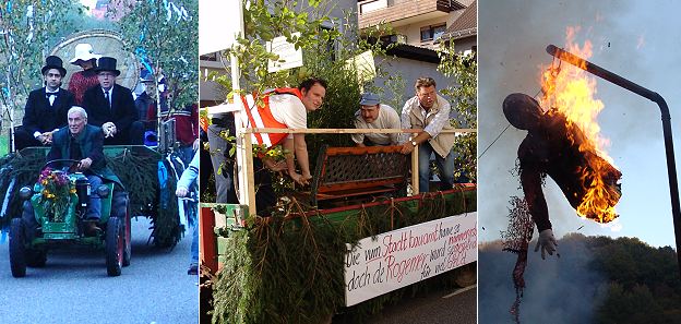 Kaiserwetter beim Umzug - Tränen bei der Schlumpelverbrennung (Fotos:Reinmuth)(hr) (at) Kaiserwetter herrschte am vergangenen Sonntag beim traditionellen Kerweumzug in Rockenau, dem Höhepunkt des viertägigen Kerwetreibens. Pünktlich um 14 Uhr setzte sich der Zug in Bewegung. Kerwepfarrer Uli Zimmermann strahlte angesichts zahlreicher Zuschauer am Wegesrand von seinem Wagen aus über das ganze Gesicht, und Kerweborscht Christofer Menges hatte die Kerweschlumpel fest im Griff. Die Musikkapelle Kleiner Odenwald sorgte für den rechten Schwung.