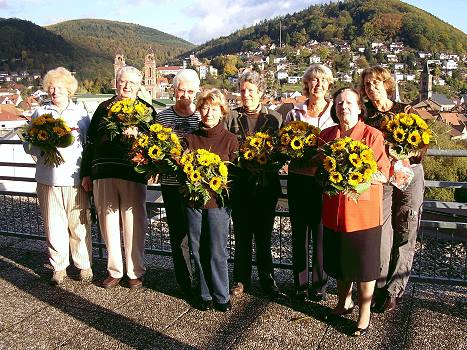 Wertvoller Dienst mit Herz für alte Menschen (Foto: privat)(bro) (ab) Mit Sonnenblumen beschenkt wurden die Mitarbeitenden im "Ökumenischen Besuchskreis" im Dr. Schmeißerstift, der Mitte Oktober sein zehnjähriges Bestehen begehen durfte. "Sie bringen den Menschen im Heim Licht, Freude und Abwechslung , sind Kontakt nach draußen, bringen das Leben von draußen zu den Menschen", so formulierte Doris Popp, Leiterin des Dr. Schmeißerstiftes, diesen Dienst. "Sie zeigen den Menschen, dass sie trotz ihres Alters wichtig bleiben, so wie diese auch für Gott wichtig sind", so die Seelsorger Hans Jürgen Habel und Andreas Bohnert. "Sie ergänzen durch Engagement mit Herz und Zeit die Dienste der hauptamtlichen Pflege und Seelsorge", betonten beide Seiten dankbar. Sechs Mitarbeitende, die seit zehn Jahren dabei sind, wurden im Rahmen der Feier geehrt, - ein Zeugnis dafür, dass dieser Dienst Zeit kostet, aber durch viele neue Erfahrungen auch bereichert und beschenkt.