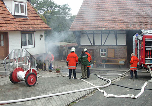Funkenflug als mögliche Brandursache Unser Foto zeigt den Brandort mit der Freiwilligen Feuerwehr Strümpfelbrunn bei den Löscharbeiten. (Foto: Baumgartner)(tb) Zu einem Brandeinsatz musste heute in den Mittagsstunden die Freiwillige Feuerwehr Strümpfelbrunn in den Nachbarort Mülben ausrücken. In einem Anwesen in der Schweizer Straße war ein Kellerbrand, verbunden mit kräftiger Rauchentwicklung, ausgebrochen. Aus bisher nicht geklärter Ursache, man vermutet jedoch Funkenflug, hatte sich eine Kiste mit Brennholz entzündet. Bedingt durch die heftige Rauchentwicklung mussten die Löscharbeiten unter Atemschutz erfolgen. Recht schnell gelang es den Feuerwehrmännern den Brand zu löschen und die noch schwelende Holzkiste ins Freie zu transportieren. Der Sachschaden konnte bislang noch nicht beziffert werden. Da aber auch die komplette Heizanlage in Mitleidenschaft gezogen wurde, wird er bestimmt bei mehreren Tausend Euro liegen.