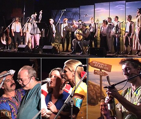 Landeier auf Eiland gestrandet (Fotos:Richter/C.Richter)(hr) Die Kombination aus "spekulativer" Odenwälder Heimatgeschichte und internationalem Liedgut ist seit Jahren das Erfolgsrezept des Odenwälder Shantychors. Am vergangenen Samstag gastierte die bunte Truppe auf Einladung des Kulturlabors und der Eberbacher Werbegemeinschaft in der voll besetzten Stadthalle. Geboten wurde das aktuelle Programm "Eiland - oder die Entdeckung der Ähnlichkeit".