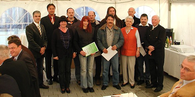 Zehn Jahre bei Fenestra Fensterbau Die Geschäftsführer Eckard Schölch und Ralf Pietsch mit den Jubilaren Heidi Rupp, Rainer Pokoy, Simone Brand, Michael Schäfer, Oskar Kessler, Michael Rösler, Renate Schölch, Andreas Danqard Walter Hammermüller und Gesellschafter Dr. Karl Hellmuth.(v.l.) (Foto:Claussen)(jc) Am vergangenen Samstag wurden bei der Fensterbau-Firma "Fenestra" in Schollbrunn anlässlich des 10-jährigen Firmenjubiläums (wir berichteten) Mitarbeiter der "ersten Stunde" geehrt.