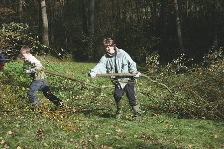 Im Oktober hieß es nun vorrangig Bewuchs aus den Tümpeln zu entnehmen und so der natürlichen Verlandung entgegenzuwirken. Dank der stattlichen Anzahl von neun jugendlichen und neun erwachsenen Helfern konnten zudem weitere Pflegemaßnahmen verwirklicht werden. So wurden Grauweiden auf den Stock gesetzt und wuchernde Brombeeren gemäht.