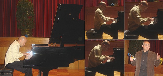 Anthony Molinaro: Neue Dimensionen klassischer Musik – Oder: Klanginterferenzen wie aus ferner Welt Auch das Beobachten des Spiels von Anthony Molinaro war höchst beeindruckend. Rechtes Bild: Tobias Soldner, der den Helfern, insbesondere der Volksbank Neckartal eG, dem Klavierhaus Udo Müller und für die Kooperation mit dem HSG und der Musikschule dankte, welche den Abend mit ermöglicht hatten (Fotos:Gündling)(ag) Anthony Molinaro, das ist ein Name, der für einiges steht: Für einen Komponisten, einen hervorragenden Jazzpianisten und einen Klavierkünstler der klassischen Musik, wie sie auch junge Menschen ins Konzert lockt. So geschehen am gestrigen Abend in der Stadthalle, in der das Kulturamt unter der Hand von Tobias Soldner in gelungener Atmosphäre den Ausnahmemusiker nach Eberbach im Rahmen der "JazzMe"-Reihe geholt hatte, der mit Standing Ovations gefeiert wurde, nachdem er mit überschlagend schönen Tönen sein Können gezeigt hatte.