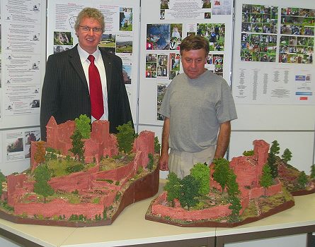 Eindrucksvolle Modelle von Burgen der Region Regionaldirektor Karlheinz Emig (links) unternahm eine Reise in die Burgengeschichte der Region und machte sich ein Bild über die fundierte Forschungsarbeit von Erwin Merz. (Foto: privat)(bro) (hb) In der Sparkassen-Hauptstelle Eberbach sind noch bis Mitte November die einzigartigen Modelle der Burgruinen Minneburg und Stolzeneck sowie eine Rekonstruktion der Kernburg Stolzeneck als auch die Eberbacher Burgen zu sehen. Angefertigt wurden die Modelle von Erwin Merz aus Neunkirchen, der sich schon seit Jahren mit dem Modellbau und der Burgenforschung befasst und die präsentierten Stücke mit Sachverstand und sehr viel Liebe zum Detail wieder zum Leben erweckt hat. Die Modelle der Burgen stellte Erwin Merz aus Pappelsperrholz (3/4 mm) im Maßstab 1:100 her, wobei er die entsprechenden Mauerstärken durch mehrere Lagen erreichte. Der Anstrich besteht aus Granitfarbe, vermischt mit Sandsteinmehl der jeweiligen Burgen. Die Bauzeit betrug einschließlich der Recherchen, Anfertigung von Plänen und der genauen Vermessung mehrere Monate. Zur Darstellung von Details waren etwa 300 Digitalbilder je Burg erforderlich. Neben den derzeit ausgestellten Modellen hat der Neunkirchener Burgenforscher auch die Burgruine Wildenberg (Preunschen bei Kirchzell/Bayern) und die Ruine Neu-Scharfeneck (Dernbach/Pfalz bei Annweiler) maßstabsgetreu rekonstruiert.