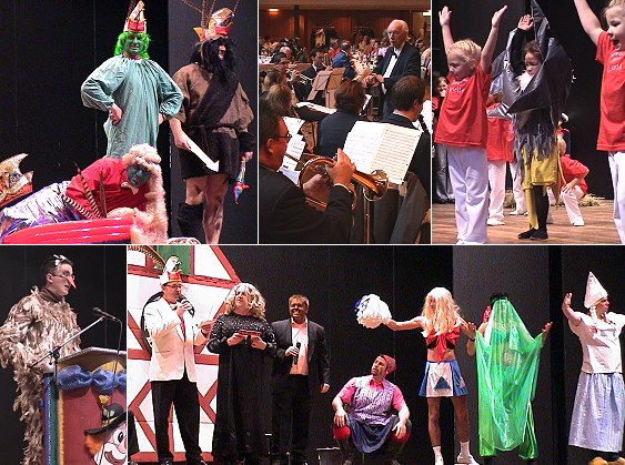 Die kleinen "Kuckuckseier" zeigten einen drolligen Schautanz (Bild oben rechts), und Björn Fellhauer schlüpfte in das Federkleid eines Sperlings. In der Bütt gestand er: "Einmal möchte ich ein Kuckuck sein" (unten links). Im Finale schließlich holte die KG Kuckuck ihre aktiven Gruppen auf die Bühne, und gemeinsam mit Gesangssolist Jürgen Huber trällerte man in kleiner Abwandlung eines Wolfgang-Petry-Songs "Weiß der Kuckuck oder weiß er nicht" (siehe Videoclip). Für die musikalische Umrahmung des Frühschoppens sorgte die katholische Pfarrkapelle unter Leitung von Gustav Rumstadt (BIld oben MItte).