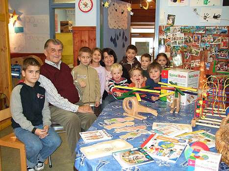 Statt Geburtstagsgeschenke eine Spende Richard Seubert mit seinen Enkeln Elia und Tristan, die auch im Kiga Regenbogen waren , einigen Kindern und Erzieherin Tanja Fellhauer aus der Wassergruppe. (Foto: privat)(bro) (isch) Im Juli 2007 feierte Richard Seubert aus Eberbach seinen achtzigsten Geburtstag . "Ein Mann in meinem Alter braucht weder Handtücher noch Trinkgläser", sagte er sich und ließ sich von seinen zahlreichen Gästen Geld für die Kinder im Kindergarten schenken. Über 180 Euro freuten sich die Kinder und Erzieherinnen. Davon wurden nun Geschicklichkeits- und Koordinationsspiele, Puzzle und Bilderbücher zum Jahresthema "Körper und Sinne" gekauft.