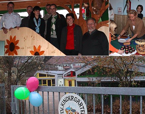 Unsere Bilder zeigen unten ein Blick von der Berliner Straße zum Kindergarten, oben links Ehrengäste beim Begang der neuen "Eichhörnchen-Ebene" (v. l. Bürgermeister Bernhard Martin, Architekt Achim Fiedler, Carmen Schreiber-Sohns, Edgar Haas von der Stadtverwaltung, Pfarrer Ekkehard Leytz, Pfarrerin Sabine König sowie der Kindergartenbeauftragte der evangelischen Kirchengemeinde Robert Löffler), oben rechts das Kuchenbuffet.