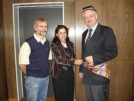 Deutschlehrerin aus Mullotschadi zu Besuch am HSG V. li.: Dr. Harald Grote, Saodat Boboalieva und Schulleiter Helmut Schultz. (Foto: privat)(bro) (sch) Mit der landestypischen Kopfbedeckung und einem schmucken Tuch beschenkte Saodat Boboalieva, Deutschlehrerin aus Mullotschadi in Tadschikistan, Schulleiter Helmut Schultz vom Hohenstaufen-Gymnasium. Im Rahmen eines internationalen Lehreraustauschs verbringt Saodat Boboalieva drei Wochen am HSG, um Erfahrungen mit dem deutschen Schulsystem zu sammeln und die hiesige Unterrichtspraxis kennen zu lernen. Initiator des Besuchs war Studiendirektor Dr. Harald Grote, der die Lehrerin während dieser Zeit auch betreut. "Sicherlich", so Dr. Grote, "wissen wir wenig von den Schulen dort. Horizonterweitung also kann aus diesem Grund nicht schaden." Schulleiter Schultz bedankte sich für die freundlichen Geschenke und wünschte der Kollegin aus dem Land der hohen Berge und grünen Täler, wie Saodat Boboalieva selbst ihr Land bezeichnet, viele positive Eindrücke und angenehme Erfahrungen in Eberbach und an der Schule. "Deutschland ist ein schönes Land", stellte Saodat Boboalieva fest, "und ich freue mich, das Land, dessen Sprache ich bei uns unterrichte, endlich selbst kennen lernen zu können." Dem Kollegium des HSG stellte Boboalieva in einer Konferenz ihr Land und ihre Schule vor, in der immerhin jeder zweite der ungefähr 750 Schüler Deutsch lernt.