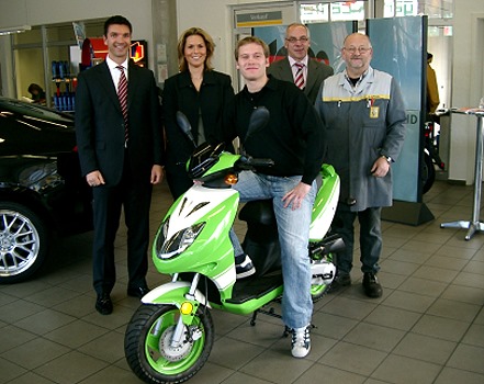 Ein Motorroller für den Gewinner V. li.: Armin Kapell (Allianz), Manuela Ding (Finanzberaterin Dresdner Bank), Florian Wurm, Hans Menges (Allianz)und Gerhard Hufnagel. (Foto: privat)(bro) (ak) Anlässlich der Eröffnung der Dresdner Bank Filiale Eberbach in den Räumlichkeiten der Allianz Generalvertretung Menges & Kapell OHG am Eberbacher Apfeltag konnten die Besucher an einem Gewinnspiel wertvoller Sachpreise teilnehmen. Der Hauptgewinn, ein Motorroller in den Farben der Dresdner Bank (grün/weiß), wurde nun bei Firma Gerhard Hufnagel an den glücklichen Gewinner Florian Wurm übergeben. Aufgrund der Wetterlage wird der Roller allerdings erst nächstes Frühjahr seine Jungfernfahrt antreten.