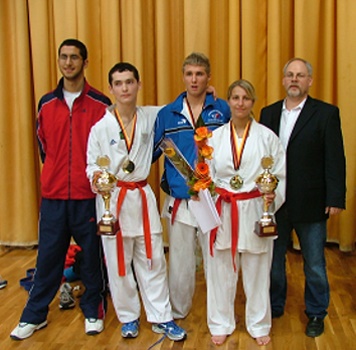 Wladislaw Gumarow holte sich zum dritten Mal den Meistertitel V. li.: Murat Seker, Wladislaw Gumarow, Sascha Tabery, Marisa Paduano (Obrigheim), Trainer Peter Steinbauer. (Foto: privat)(bro) (pst)Mit einem fantastischen Erfolg setzten sich die Eberbacher Karatekas bei den Deutschen Juniorenmeisterschaften in Schwerin in Szene. Gleich alle drei Starter der Budokai "ASAHI" Eberbach, die im Juli ohne Probleme die Qualifikation über die Landesmeisterschaften schafften, konnten sich auf den vorderen Rängen mit einen ersten, einem dritten und einem fünften Platz behaupten.