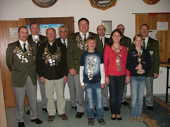 Johannes Zipp wurde neuer Schützenkönig V.l.: Matthias Helm, Udo Helm, Schützenkönig Johannes Zipp, Rolf Neureuther, Achim Helm, Florian Helm, Horst Helm, Isabell Neureuther, Dieter Böhm, Tanja Lindenmuth und Volker Lindenmuth. (Foto: Wartner) (bro) (ewa) Die Schützenfamilie hatte sich zahlreich im Schützenhaus versammelt. Die Spannung war groß. Wer ist der neue Schützenkönig? Doch bevor das streng gehütete Geheimnis gelüftet wurde, standen Ehrungen auf dem Programm. Für zehnjährige Mitgliedschaft erhielten die Vereinsnadel in Bronze Florian Helm, Timo Schäfer, Katja Wäsch, Nico Helm, Dieter Böhm, Tanja Lindenmuth, Michael Klingler und Tamara Gagliardi. Mit der silbernen Vereinsnadel für 20-jährige Vereinstreue wurden Rudolf Fritsche und Torsten Neureuther ausgezeichnet. Die Ehrennadel des Deutschen Schützenbundes (DSB) und des Badischen Schützenverbandes (BSV) haben sich Heidrun Rupp, Harald Helm, Thomas Helm und Fritz Lehr für 25-jährige Zugehörigkeit verdient. Bereits 40 Jahre hält Gertrud Köbler dem SSV Lindach die Treue. Sie wurde dafür mit der Ehrennadel des DSV und des BSV mit Urkunde geehrt. Dann endlich löste Oberschützenmeister Rolf Neureuther die Spannung. Mit großem Jubel wurden Johannes Zipp als neuer Schützenkönig, Achim Helm als erster Ritter und Matthias Helm als zweiter Ritter gefeiert. Nicht minder Beifall erhielten anschließend die Sieger in der Jugendklasse: Isabell Neureuther als Jugendschützenkönigin, Florian Helm, der es seinem Vater nachmachte, als erster Ritter und Max Falckenthal als zweiter Ritter. Der Pokal in der Schützenklasse ging an Udo Helm, den der Jugendklasse eroberte sich Daniela Lindenmuth. Gleichzeitig wurden auch die Vereinsmeister geehrt: Axel Becker in der Disziplin Luftgewehr, desgleichen Isabell Neureuther in der Jugendklasse. Und im Kleinkaliberschießen und im KKS liegend sicherte sich Horst Helm gleich beide Meistertitel.