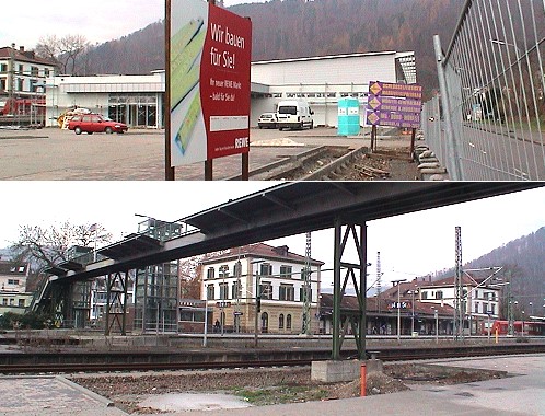 Am 10. Januar soll der neue Supermarkt öffnen Oben die Supermarkt-Baustelle, unten die Stelle am Parkplatzrand, an der der Treppenaufgang und der Aufzug zum verkürzten Steg vorgesehen ist. (Fotos:Richter)(hr) Nach einem guten Jahr Bauzeit für den REWE-Verbrauchermarkt in der Güterbahnhofstraße gibt es jetzt einen Zeitplan für die Fertigstellung. Wie Stadtbaumeister Manfred Janner heute im Gemeinderat mitteilte, soll der Geschäftsbetrieb am 10. Januar 2008 starten. Weil es sich um eine Standortverlegung des bisherigen Marktes im Schafwiesenweg handelt, wird dieser am 5. Januar letztmals geöffnet sein.