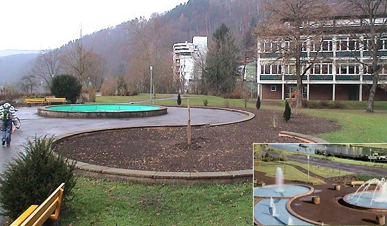 Einstiges Postkartenmotiv ist nicht mehr Das jetzt abgebaute "Bananenbecken" war auf vielen alten Ansichtskarten abgebildet (kleines Foto rechts). (Foto/Repro:Richter)(hr) Abgebaut wurde dieser Tage das wegen seiner Form so genannte "Bananenbecken" der Wasserspiele zwischen Berufsschulzentrum und Bundesstraße 37 am Neckar. Eberbach ist damit um ein beliebtes Postkartenmotiv ärmer: Viele Ansichtskarten - besonders aus den 60er Jahren - trugen das Bild der Eberbacher Wasserspiele in die Welt hinaus. Das Stadtbauamt vollzog mit dem "Rückbau" des Beckens einen Beschluss des Bau- und Umweltausschusses vom Juni 2005 (wir berichteten).