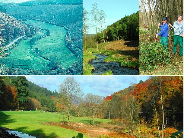 Offene Tallandschaften: Weichen für die nächsten Jahre gestellt Oben links eine historische Aufnahme des "Eberbacher" Sensbachtals (rechts des Bachlaufs) aus den 1950er Jahren. Daneben ein Bild des Tales kurz nach Abholzungsarbeiten auf Eberbacher Seite in diesem Frühjahr, oben rechts der NABU-Trupp, unten das Pleutersbacher Tal nach der Pflege im Herbst 2007. (Fotos:privat/StVE)(hr) (stve) Die offenen Wiesentäler sind unbestritten ein besonders reizvolles Landschaftselement des südlichen Odenwalds. Doch mit dem Strukturwandel der Landwirtschaft und dem Verlust der kleinbäuerlichen Betriebe verschwinden auch die früheren Bewirtschafter. Vielerorts wird zu Recht darüber geklagt, dass die Wiesentäler mit der Zeit zuwachsen und allmählich in Wald übergehen. Der Begriff vom "Pflegenotstand der Landschaft" macht die Runde.