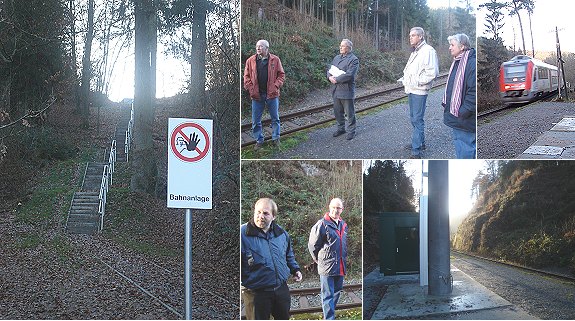 Neue Bahnhaltestelle - Bald Fahrtmöglichkeit von Friedrichsdorf nach Frankfurt? Treppenaufgang zur Bahnanlage, Lagebesprechung: Harald Friedrich, Ortsvorsteher Horst Weis, Julius Friedrich und Hildegard Neubert vom Ortschaftsrat (oben, v.l.). Marcus Friedrich und Peter Krämer von der Odenwaldbahn, der bereits ausgebaute Bahnsteig (unten, v.l.). (Fotos:Gündling)(ag) Den Wandergruppen, Odenwaldfreunden, Familien, Müttern und Besuchern könnten die Herzen bald höher schlagen, wenn der Bahnhaltepunkt Friedrichsdorf in die Tat umgesetzt wird.