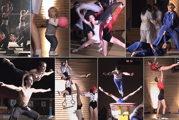 Jährliche TVE-Show wird immer professioneller Oben v.l. die "Step Machine", Klein und Groß beim Volleyball, der "Tanz der Vampire" und die Judoshow, darunter v.l. "James Bond", "Fluch der Karibik", die TVE-Jugendturner und als Gast Sportakrobatik vom TSV Sensbachtal. (Fotos:Richter)