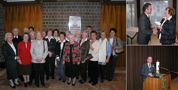 Nach einem stilvollen musikalischen Einstieg ins Festprogramm, dargeboten von Godehard und Fabian Weithoff an Klavier und Geige, begrüßte Ulrike Kraus im Namen des Leitungsteams der katholischen Frauengemeinschaft (kfd) Sankt Johannes Nepomuk die Gäste. Erika Hils ließ im anschließenden Rückblick die Geschichte des Handarbeitskreises und das karitative und soziale Engagement der Damen noch einmal Revue passieren. Über die persönlichen Freuden, die die Handarbeitsdamen seiner Familie mit ihren Produkten bereitet hatten, ließ sich humorvoll Bürgermeister Bernhard Martin aus. „Schlabberlätze mit Klettverschluss oder gestrickte Füßlinge für Neugeborene, die auch noch an den Füßchen halten – wo findet man so was außer im Handarbeitskreis?“ Er philosophierte über die Waffen der Frau“, mit denen sie die Welt in den vergangenen fünf Jahrzehnten verbessert hätten. In diesem Falle: „Strick- und Häkelnadeln!“ Als Anerkennung für dieses Engagement überreichte er der Leiterin des Kreises, Rosemarie Bussemer, eine Urkunde der Stadt, verbunden mit einem der beliebten bändchenverzierten Umschläge. Zahlreiche Grußworte stimmten ein in die Glückwünsche und den Dank für das in den vergangenen fünf Jahrzehnten Geleistete. Zu guter Letzt ergriff auch Rosemarie Bussemer das Wort: sie dankte den Mitarbeiterinnen des Eberbacher kfd-Leitungsteams für die gelungene Vorbereitung und Durchführung der Festlichkeit.