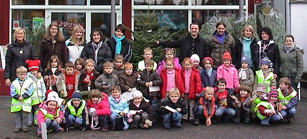 Weihnachtsbäume und Geldspenden für Kindergärten Sven Bauer (hinten Mitte) mit den Beschenkten. (Foto:C.Richter)(cr) Kinder mit großen staunenden Augen gab es vorgestern bei der Firma Markisen-Bauer zu sehen, hatten sie doch glatt den Nikolaus verpasst.