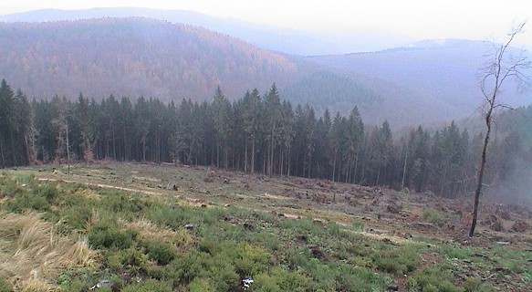 Ohne Berücksichtigung der Kosten für Erholungseinrichtungen soll im kommenden Jahr ein Gewinn von 132.000 Euro im Stadtwald erwirtschaftet werden. Neben der Ernte von Holz werden auch wieder Pflanzungen notwendig. Vor allem auf den durch Stürme und Borkenkäfer entstandenen Kahlflächen (unser Bild) will man rund 6.000 junge Bäume setzen. Jungbestandspflegearbeiten und so genannte "Wertästungen" zur späteren Erzeugung von wertvollen astfreien Stämmen bilden weitere Schwerpunkte der Arbeitsplanung im städtischen Forst. Hinzu kommen Unterhaltungsmaßnahmen an Waldwegen und Meliorationskalkungen, die gegen die Bodenversauerung wirken sollen. Letztere werden im Eberbacher Stadtwald schon seit 1981 regelmäßig durchgeführt und durch Landeszuschüsse gefördert.