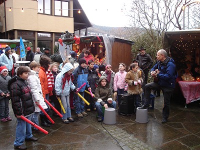 Kleine Sänger ganz groß (Foto:Gündling)(ag) Auch die ganz Kleinen kamen ganz groß auf dem Eberbacher Weihnachtsmarkt heraus. Die zweite, dritte und vierte Klasse der Dr. Weiß-Schule zeigte ihr Können unter der Leitung von Christopher Reinke an der Gitarre. Dabei ging es richtig schön musikalisch zu, unter den Augen der Eltern, die sich mit ihren Kindern freuten, die sich nämlich freitags treffen, um miteinander zu singen. Und natürlich durfte beim Chorauftritt auch nicht ein Schlagzeuger fehlen.