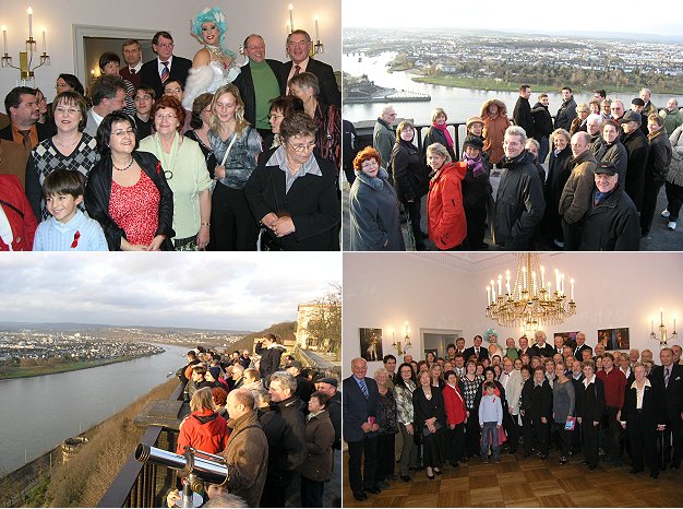 Zwingenberger besuchten ihren neuen Intendanten Karsten Huschke an seinem Wirkungsort Ein Teil des Festspielchors mit Geschäftsführer Michael Keilbach (l.), Vorstandsvorsitzendem Dr. Achim Brötel (2. Reihe, 3.v.l.) und dem Star des Abends, Diseuse „Zaza“ alias Adrian Becker (oben links). Der Festspielchor zu Gast in Koblenz: hier auf der Festung Ehrenbreitstein. Chor, Vorstand und Geschäftsführung der Schlossfestspiele Zwingenberg zu Gast bei Intendant Karsten Huschke (Mitte vorne), hier im Oberen Foyer des Theaters der Stadt Koblenz. Und über allen thront der Star des Abends, Diseuse „Zaza“ alias Adrian Becker (unten rechts). (Fotos:Nolten-Casado)(ag) (bnc) Es war fast wie ein richtiges Familientreffen, zu dem mehr als fünfzig Sängerinnen und Sänger des Festspielchors der Schlossfestspiele Zwingenberg Samstagfrüh gen Koblenz aufbrachen. Die Stadt am Zusammenfluss von Rhein und Mosel hatte man zum Ziel des traditionellen Jahresausflugs gewählt, ist ihr Theater doch der Wirkungsort des neuen Zwingenberger Intendanten Karsten Huschke. Selbiger nahm die Sängerschar bereits vor den Toren der Stadt in Empfang, um dem Ensemble beim gemeinsamen Mittagessen mit seiner ihm eigenen ansteckenden Begeisterung das Programm der kommenden Spielzeit schon einmal schmackhaft zu machen. Mit dem Musical „My fair Lady“, Mozarts „Cosí fan tutte“ und der großen Oper „Carmen“ von Georges Bizet kommt schließlich wieder einiges an Arbeit auf die stets hochmotivierte Gesangstruppe zu.
