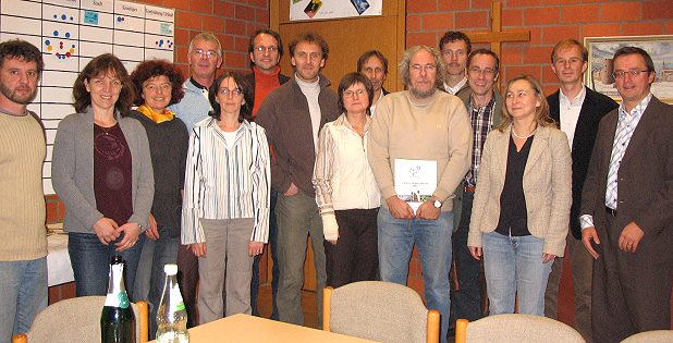Die evangelische Kirchengemeinde wurde gemäß EMAS validiert Das Ziel wurde erreicht. Auf dem Foto: der Vorsitzende des Umweltausschusses Martin Gumb (4.v.l.), der Umweltbeauftragte der Badischen Landeskirche André Witthoeft (6.v.l.), der Vorsitzende des Kirchengemeinderates Pfarrer Ekkehard Leytz (4.v.r.), EMAS-Prüfer Georg Hartmann (1. v. r.) sowie die Mitglieder des Umweltausschusses. (Foto: privat)(bro) (ft) Grund zum Feiern hatte die Evangelische Kirchengemeinde: Zwei Jahre wurde vom Umweltausschuss hart daran gearbeitet, die Voraussetzungen für die Zertifizierung als umweltgerecht handelnde Gemeinde gemäß den europäischen Richtlinien (EMAS) zu erfüllen. Nach einem halben Tag Prüfung, an dem neben Stichproben im Kindergarten Regenbogen, der Michaelskirche und dem Gemeindehaus am Leopoldsplatz auch die Entscheidungsstrukturen, die Öffentlichkeitsarbeit und die Mitarbeiterschulung auf dem Prüfstand standen, setzte der vereidigte Prüfer seine Unterschrift unter den 63-seitigen Umweltbericht, in dem penibel sowohl die Messergebnisse der letzten beiden Jahre als auch die Ziele für die nächsten drei Jahre aufgelistet sind.