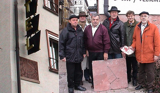 Bürger- und Heimatverein erneuert Sonnenuhr Links die neue Sonnenuhr an der Hotelfassade, rechts Gerald Hildenbrand, Bernhard Martin, Hans Veith (mit der "alten" Sonnenuhr), Paul Sillak von der Firma Rebscher, Hotelchef Uwe Jung und Günter Lipski (v.l.). (Fotos:C.Richter)(cr) Vorgestern am Nikolaustag machte auch in diesem Jahr der Bürger- und Heimatverein Eberbach (BHV) den Bürgerinnen und Bürgern der Stadt Eberbach wieder ein Geschenk: eine Sonnenuhr.