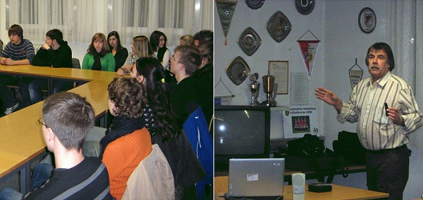 Danach begann eine kurzweilige, etwa zweistündige Präsentation mit dem Videobeamer. Volker Karl kommt auf die Modedrinks, "die Flügel verleihen" sowie harmlos erscheinendes Trinkbrausepulver, das aber die Alkoholwirkung völlig unkontrolliert verstärkt, zu sprechen. Dann ging es direkt zu den illegalen Drogen. In einer "Stoffkunde" kommt es auch darauf an, dass der/die junge Kraftfahrer/in auch in der Lage ist, Betäubungsmittel zu erkennen, wenn nach dem Aussteigen eines Mitfahrers etwas liegen bleibt. Denn an einer polizeilichen Kontrollstelle besteht auch bei minimalen Mengen aufgefundenen Rauschgifts erheblicher Erklärungsbedarf. Eindrucksvolle Filmsequenzen vermitteln den Fahranfängern wie "zugekiffte Augen" aussehen und zu welchen "Fehl-Leistungen gedopte Kraftfahrer" fähig sind. Und, welche rechtlichen Konsequenzen auf junge Kraftfahrer zukommen können, wenn sie unter der Einwirkung von Drogen stehend angetroffen werden. Die filmische Darstellung der letzten Lebenssekunde eines Verkehrsunfallopfers beim Frontalzusammenstoß mit einem am Straßenrand stehenden Baum setzt zum Schluss der Veranstaltung noch einmal ein Ausrufezeichen. Dafür, dass reine Aufmerksamkeit, eine klare Wahrnehmung und die Beachtung der Verkehrsregeln, insbesondere von Geschwindigkeitsbegrenzungen, die beste Vorbeugung vor schweren Verkehrsunfällen ist.