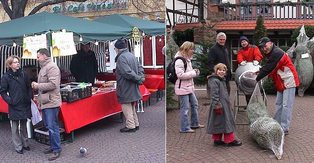 Weihnachtliche Aktionen der Serviceclubs (Fotos:C.Richter)(cr) Alljährlich fragen sich kurz vor Heiligabend viele Menschen: "Woher nehmen wir einen frischen Weihnachtsbaum?". In Eberbach haben die Serviceclubs Rotary und Lions eine Antwort auf diese Frage parat. Man geht einfach auf den Lindenplatz. Denn dort waren gestern etwa 20 Mitglieder des Lions Clubs im Einsatz und boten die Weihnachtsbäume an, die sie vorgestern erst eigenhändig geschlagen hatten. Man hatte hier nicht nur die richtigen Ansprechpartner in Sachen Baum, sondern auch Männer die richtig anpacken. Denn alle Bäume konnten transportfertig eingenetzt werden.
