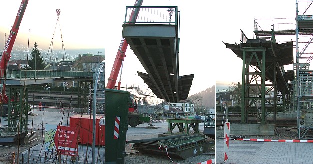 Der Steg über die Bahngleise ist kürzer geworden (Fotos:Richter)(hr) Verkürzt wurde heute der Fußgängersteg am Bahnhof. Das Teilstück zwischen der Güterbahnhofstraße und dem künftigen Stegaufgang am Rand des neuen Supermarkt-Parkplatzes wurde mit Schneidbrennern abgetrennt und mit einem schweren Kran abgehoben.