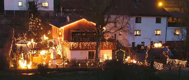 Bei 8.000 Lämpchen aufgehört zu zählen (Foto:Richter)(cr) Lichterketten an Häusern und leuchtender Fenster- und Balkonschmuck in der Vorweihnachtszeit sind in den letzten Jahren stark in Mode gekommen. Mit Einbruch der Dunkelheit zeigt sich dann manches Anwesen in stimmungsvollem Lichterglanz. Und dabei gibt es Hausbesitzer, die mit Lämpchen und Kabeln an Haus und Garten wahre Lichtkunstwerke schaffen. Im Sensbachtaler Ortsteil Hebstahl findet sich inmitten ländlicher Idylle solch ein "leuchtendes" Beispiel, das inzwischen zu einer Attraktion in der Region geworden ist.