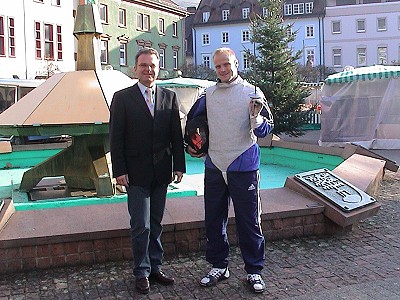 Eberbach ist Schauplatz für internationales Ranglistenturnier im Damenflorett Eberbachs Bürgermeister Bernhard Martin und Fechttrainer Jürgen Poerschke vom Fecht-Club Mosbach freuen sich auf spannende und hochkarätige Wettkämpfe in der Hohenstaufen-Sporthalle. (Foto:C.Richter)(cr) Auf dem Weg nach Olympia machen die deutschen Florettfechterinnen am 12. Januar Station in Eberbach: Fechtsport auf höchstem Niveau erwartet die Besucher des Internationalen Damenflorettturniers um den "Gelita Cup" am Samstag, 12. Januar, in der Hohenstaufen-Sporthalle.