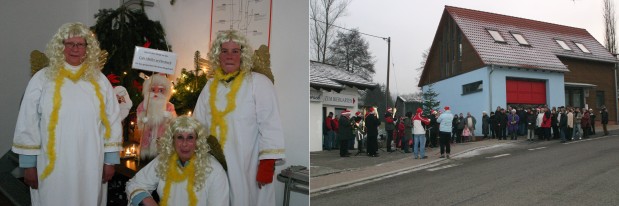 Drei Engel für... Allemühl Drei Engel sorgten am Glühweinstand für gute Laune. Viele Gäste kamen nach Allemühl.(Fotos: Böhm)(ub) Frostig kalt und trocken- so muss das Wetter sein, damit der Glühwein schmeckt. Wie in jedem Jahr machte die Allemühler Musikkapelle unter der Leitung von Jürgen Konrad jedem Schönbrunner Ortsteil seine Aufwartung. Terminlich war es in diesem Jahr geschickter, schon einen Tag vor Heiligabend den rund 150 Gästen am Allemühler Feuerwehrhaus seine musikalischen Weihnachtsgrüße zu überbringen. In Allemühl überraschten drei Engel die jährlich immer größer werdende Schar der Zuhörer mit allerlei Leckereien. Neben Glühwein und Würstchen, gab´s auch Kaffee. Die Plätzchen dazu wurden vom Café Müller aus Eberbach gestiftet.