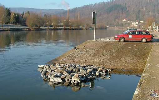 Der Gemeinderat beschloss nun eine kurzfristige Sicherungsmaßnahme der Rampe, bei der die ausgespülten Stellen mit groben Wasserbausteinen aufgefüllt werden. Diese Lösung ist mit rund 20.000 Euro zwar preisgünstig, hat aber den Nachteil, dass die aufgefüllten Stellen der Rampe unter der Wasseroberfläche nicht befahrbar sind.