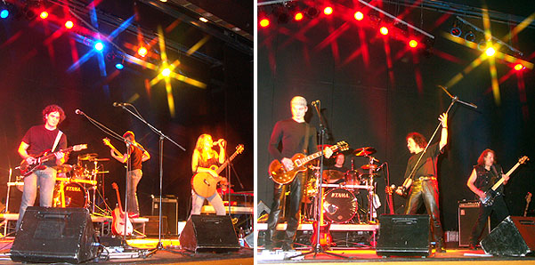 Gute Stimmung beim diesjährigen Weihnachtsrock Rund 800 Rockfans zählte das Kulturlabor beim diesjährigen Weihnachtsrock , als "Scarlett´s Playground" (linkes Bild) und insbesondere "Gipsy" die Stadthalle Eberbach rockten. (Fotos: Baumgartner)(tb) Das Weihnachtskonzert als Rockkonzert zum Abschluss des jeweiligen Veranstaltungsjahres ist beim Kulturlabor ein fester Bestandteil des Veranstaltungskalenders. Auch in diesem Jahr engagierte das Kulturlabor zwei Top-Acts, die rund 800 Leute in die Stadthalle lockten. Opener der Rocknacht war die Cover-Rock-Band "Scarlett´s Playground" um Frontfrau Scarlett Seither. Als Opener des Abends hatte es die Band nicht leicht, das Eberbacher Publikum auf Touren zu bringen. Solide Rock-Klassiker von Joan Jett, Toto oder AC/DC waren eigentlich ein Garant für gute Stimmung. Aber zum einen war der Sound in der Halle nicht gerade optimal für Band abgestimmt, zum anderen drehte sich aber bei "Scarlett´s Playground" musikalisch und sängerisch alles um Frontfrau Scarlett Seither, deren Stimme bei einigen Stücken schlichtweg überfordert war. Dennoch gab es von der Band das versprochene "letzte Lied nach dem letzten Lied", welches auch von ein paar Musikfans gefordert wurde.