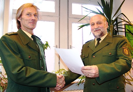Unser Bild zeigt Hans-Werner Behm (l.) bei der Verabschiedung durch Revierleiter Erich Lindenthal.