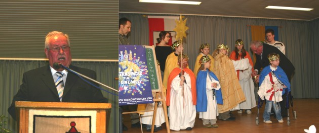 Bürgermeister Roland Schilling sagt zum Abschied leise Servus Bürgermeister Roland Schilling hielt seine letzte Neujahrsansprache, ehe im März ein neuer Bürgermeister gewählt wird. Die Sternsinger und die Musikkapelle "Kleiner Odenwald" Allemühl umrahmten das umfangreiche Programm. (Fotos: Böhm)(ub) Viele Gäste aus Handel, Banken, Dienstleistung, Vereinen, Feuerwehr, DRK, Polizei, Selbsthilfevereinen und Politik waren gekommen, um gemeinsam mit Bürgermeister Roland Schilling und seiner Gattin den letzten Neujahrempfang in seiner Amtszeit zu begehen.