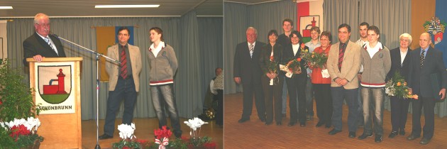 Auszeichnung von zwei Schönbrunner Weltmeistern Wolfgang Jung und Alexander Göhrig wurden im Rahmen des Neujahrsempfanges als Weltmeister von Bürgermeister Roland Schilling geehrt, der auch weitere Sportler und ehrenamtlich Tätige auszeichnete. (Fotos: Böhm)(ub) „Wann ist es einem Bürgermeister schon einmal vergönnt, sogar zwei Weltmeister auszuzeichnen?“, fragte Schönbrunns Bürgermeister Roland Schilling bei der diesjährigen Sportlerehrung anlässlich des Neujahrsempfanges in die Runde seiner Gäste. Der überaus erfolgreiche Bogenschützenclub Allemühl kann auf viele Erfolge zurückblicken. In diesem Jahr stellt er mit Wolfgang Jung und Alexander Göhrig gleich Weltmeister in dem 300-Seelen- Ortsteil Allemühl der Gemeinde Schönbrunn. Sichtlich gerührt nahm Teanie- Schwarm Alexander Göhrig die Auszeichnung von Schilling entgegen, die er für seinen Weltmeistertitel in der Klasse Bowhunter Compound Jugend, den er im schweizerischen Wildhaus erzielte, entgegen. „Du musst in der Schule mit deinem Weltmeistertitel bestimmt der Schwarm aller Mädchen sein“ schmunzelte Schilling, ehe er Wolfgang Jung ebenfalls zu seinem Weltmeistertitel beglückwünschte. Diesen Titel errang Jung ebenfalls in Wildhaus in der Klasse der Bowhunter Compound Limited. Zusätzlich wurde der überaus erfolgreiche Bogenschütze, der seit Jahren ein Garant für kontinuierliche Topleistungen ist, den Deutschen Meistertitel in Jagd und Feld in Wyhl und überzeugte mit jeweils einem zweiten Platz bei der Hallen- Weltmeisterschaft in Mannheim und bei der Deutschen Hallenmeisterschaft.