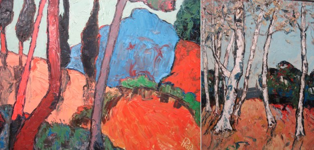 Zwischen leidenschaftlicher und zurückhaltender Betonung – Werke aus Frankreich Malereien in Öl von Herbert Pape - „Paysage du Lubéron“(links) und „Bouleaux en automne“. (Fotos:Gündling)(ag) Noch sind die Exponate von Herbert Pape im Rahmen der „ART-Vent“ in der Galerie ARTgerecht zu sehen, bevor mit Joe Hackbarth am 27. Januar der Ausstellungsturnus wechselt.