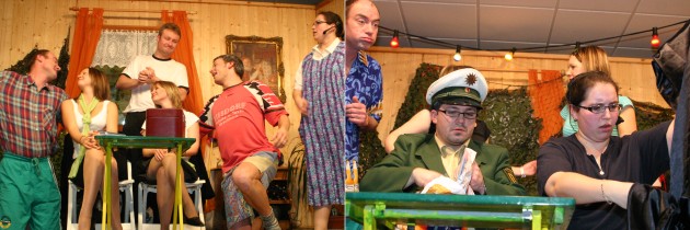 Das Lustspiel in drei Akten „Mit Schlafsack und Kamillentee“ von Erfolgsautorin Regina Hösch stellt die menschlichen Schwächen wieder einmal brillant dar, schwächelte aber im Finale des dritten Aktes. Die beiden Freunde Gottfried Pfennig (Martin Henrich) und Oswald Fuchs (Holger Rudolf) haben ihren beiden Frauen Olga Pfennig (Kerstin Straub) und Klothilde Fuchs (Christel Braus) zum 50. Geburtstag eine 14-tägige Luxusreise auf dem Traumschiff AIDA versprochen und sich bislang erfolgreich davor gedrückt. Viel lieber pflegt Gottfried seine eingebildeten Krankheiten zuhause auf dem heimischen Sofa und wird dabei von seinen besten Freunden Oswald (Holger Rudolf), Polizist Franz Fischer (Torsten Heckmann) und seinem Sohn Klaus (Sascha Zimmermann) unterstützt. Die Zugluft ist das größte Gift für Gottfried, denn „do grigg ich glei e Otitis media“. Drum trägt er auch gleichzeitig vier Paar Socken, und das innerste Paar ist rot, denn „des fäderd die Durchbluudung“. Und bei kaltem Wasser „grigg ich´s glei widda an die Bloos“. Statt einem gepflegten Bier unter Freunden trinkt Gottfried lieber seinen Kamillentee. Freund Oswald hat eine gute Idee und wird quicklebendig, als er mit seinem Fernglas „niwwer guggt- an de FKK- Strand“. Gottfried beeindruckt das nicht und so empfiehlt Gottfried „liwwer mit seine roode Sogge uff´m Sofa ligge zu bleiwe und Kamilletee zu saufe“. Die Ehefrauen sind beim aufziehenden Gewitter mit dem Bulldog nach Heidelberg unterwegs. Sohn Klaus stellt fest, dass es „Wasser runna regnet- nix als Wasser“. Trocken stellt Oswald fehlt, „dass er sich gar net erinnern kann, wann´s ledschde Mol Bier geregnet hot“. Ausgestattet mit Ferngläsern stellen die Mannsbilder fest: „Do driwwe laffe se alle nackt rum- jo die spinne- die Allemiehler“ und dass es sich in heimischen Gefilden bessert urlaubt als im Ausland. Lapidar stellt Franz zudem fest : „Überleg mol, mit ner Kiddelscherz kansch dei Alde net uff die AIDA mitnemme“. Neie Kleeder- was des alles koschd!“ Und so versuchen die drei Männer mit List, die Kreuzfahrt auf dem Luxusdampfer zu verhindern und lieber einen Urlaubsort zu finden, „wo ma mit´m Bulldog no fahre kann“. Zunächst ist guter Rat teuer! Gemeinsam mit Polizist Klaus und Sohn Klaus finden die beiden leidgeprüften Ehemänner aber rasch eine Lösung: „Zelten auf dem Hirschhorner Campingplatz, denn von da kann man rasch zur Moosbrunner Ortsmeisterschaft“ eilen. Zugleich kann Olga auch fremde Sprachen hören, denn „bestimmt sind auch Holländer auf dem Campingplatz“. Doch wie die Frauen vom Campen überzeugen? Die fingierte Reise nach Hirschhorn soll über Radio SWR4 verlost werden. Kurzweilig, für die von Lachsalven geschüttelten Zuhörer, übt Gottfried seine Sprechprobe als Moderator und auch die Preisfrage ist schnell von Oswald gefunden: „Welche Schuhe trägt der Papst unter seinem langen Rock?“. Die Antwort, da sind sich alle sicher, kennt Olga bestimmt: „Roode Schuh´, denn die basse so gut zum geblimelde Rock“. Mit List und Tücke gelingt es dem Team, die Reise ins Hirschhorner Campingparadies an Olga zu verlosen und diese „verpflichtet sich verbindlich – ohne das Reiseziel zu kennen -die Reise anzutreten“. Hoffnungsvoll meint sie noch: „Zur Not nemme ma a statt der AIDA e Reise zu de Malodivien“. Die Bescherung nimmt seinen Lauf. Als Gewinn präsentiert „Moderator“ Gottfried einen 14-tägigen Campingurlaub für sechs Personen auf dem einmaligen Campingplatz in Hirschhorn“. Oswald fragt sich „ja , ab wo flieje mer ab? Ab Frankfort ? Mit Schlafsack und Kamillentee?“