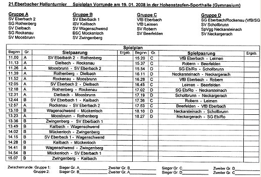 Am Wochenende steht die Hohenstaufenhalle im Zeichen des Hallenfußballs Der Spielplan der Vorrunde. Am Sonntag geht es mit der Zwischen- und Finalrunde ab 13 Uhr weiter. Das Endspiel beginnt um 17.50 Uhr. (Repro:Claussen)(jc) Die SpVgg Neckarsteinach hat das Eberbacher Hallenfußballturnier in den letzten Jahren dominiert. Bei der 21. Auflage des Turniers werden am kommenden Wochenende 18 Mannschaften versuchen, den fünften Sieg in Folge beim Hallenturnier des SV Eberbach zu verhindern. Im vergangenen Jahr war der FC Hirschhorn im Finale chancenlos und unterlag mit 2:5 Toren. Zuvor hatten die Hirschhorner dem SV Eberbach einen Strich durch die Rechnung gemacht, nach vielen Jahren wieder einmal ins Finale einzuziehen. Mit einem bisher guten Lauf in der Freiluft-Saison möchten die Neckarwimmersbacher in diesem Jahr endlich auch in der heimischen Halle fußballerisch wieder ein entscheidendes "Wörtchen" mitreden.
