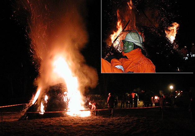 Fastnachtsfeuer brannte in Friedrichsdorf Die Ittertäler "Marsmenschen" schlüpften zum Teil direkt nach ihrem "Fastnachtsumzugs-Einsatz" auf dem "Ufo-Umzugswagen" in die Feuerwehrkluft und schafften es dann auch im Handumdrehen das durchnässte Brandmaterial zu entzünden. (Fotos:Claussen) (jc) Einem Brauch folgend, brannte heute, am Fastnachtsdienstag, auch auf der Heidewiese in Friedrichsdorf wieder das aus alten Weihnachtsbäumen aufgeschichtete Fastnachtsfeuer. Der Tradition nach, soll damit dem Winter der Garaus bereitet werden. Mit Glühwein, Kinderpunsch und schallender Musik vom Ittertäler Umzugswagen konnten sich die rund 70 Besucher bei abklingendem Regenwetter aufwärmen.