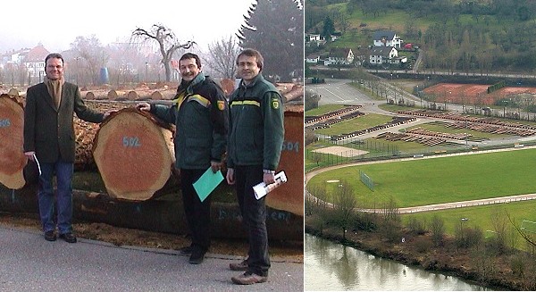 Ist Eberbacher Holz bald in Luxusyachten zu finden? Bürgermeister Bernhard Martin mit den Förstern Helmut Schnatterbeck und Gerald Richter (v.l.).(Fotos:C.Richter/Kreisforstamt)(cr) Wenn der Eberbacher Festplatz in der Au abgesperrt ist, baut in der Regel entweder ein Zirkus seine Zelte auf oder der Kuckucksmarkt steht mal wieder vor der Tür. Diesmal ist das anders: Seit Januar dieses Jahres fuhren Holzlaster den Platz an, um riesige Baumstämme abzuladen.
