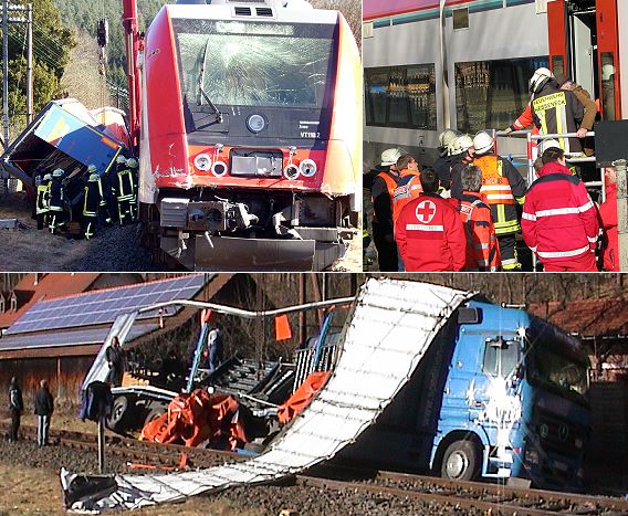 Odenwaldbahn krachte in Sattelzug (Fotos:privat/Polizei/Richter)(hr) (pol) Glimpflich haben 15 Fahrgäste, ein Lokführer und ein Lkw-Fahrer heute Vormittag in Hesseneck-Schöllenbach einen Zusammenstoß zwischen einem Zug der Odenwaldbahn und einem Lkw überstanden. Der entstandene Sachschaden beläuft sich nach ersten Schätzungen auf über eine Million Euro.