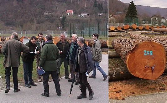 Spitzenreiter mit einem Zuschlagspreis von 716 Euro je Festmeter wurde ein Lärchenstamm aus dem Stadtwald Eberbach (rechtes Bild). Er geht an ein Furnierwerk. Das Holz der Stadt Eberbach erzielte mit gut 415 Euro fast den höchsten Durchschnittspreis der gesamten Submission, nur übertroffen von der Gemeinde Untergruppenbach bei Heilbronn, die es auf 422 Euro je Festmeter brachte.