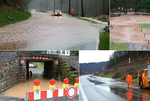 Behinderungen nach starken Regenfällen und Sturmböen (Fotos:Richter)(hr) Zu örtlichen Überflutungen kam es heute Morgen nach den starken Regenfällen der vergangenen Nacht. Während der Neckar selbst in seinem Flussbett blieb, waren seine Nebenflüsse stärker betroffen. Im Allemühler Tal (Bilder oben) fasste ein Durchlass die Wassermassen nicht, die daraufhin die L 595 auf einer Länge von rund 100 Metern überfluteten. Auch die Itter ist stark angeschwollen und steht derzeit am Rand der Wilhelm-Blos-Straße. Auf der Bundesstraße 37 sorgte Hangwasser für Behinderungen (Bild unten rechts) und überflutete einige Unterführungen, wie auf unserem Bild an der Neckarhälde.