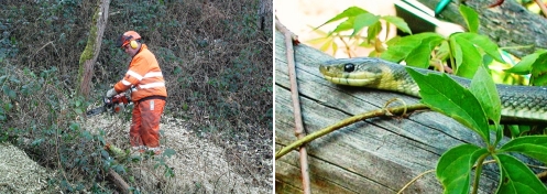 Schnittgut bleibt liegen und dient Äskulapnattern als Biotop Ein Mitarbeiter der Straßenmeisterei beseitigt eine abgestorbene Salweide.Die Äskulapnatter als prominente Bewohnerin der Straßenböschung.(Fotos: Bernecker)