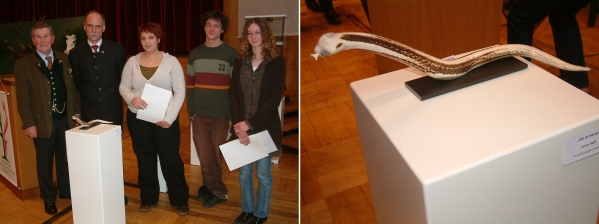 Der Schritt von Kunsthandwerk zu Kunst ist nicht weit (v.li.) Der 2. Vors. der Vereinigung der Rotwildjäger Karl-Heinz Fanselow, Vorsitzender Dr. Andreas Wiese, Preisträger/in Anna Heiß, Jakob Mühlbauer und Marcy Lucas. Die "Schlange" von Anna Heiß erreichte den 1. Preis.(Fotos:Wörner)(tw) Auf Initiative ihres Vorsitzenden Dr. Wiese im Jahr 2007, lobte die Vereinigung der Rotwildjäger in Zusammenarbeit mit der Berufsfachschule Holz-Elfenbein in Michelstadt unter den dortigen Auszubildenden der Fachrichtung Elfenbeinschnitzer und Drechsler einen Wettbewerb mit dem Titel: "Geweihtiere" aus. Mitglieder der Vereinigung stellten den Schülern als Arbeitsmaterial Geweihstangen zur Verfügung. Damit soll das Bemühen der Schule zur Vermittlung von handwerklicher und künstlerischer Kompetenz unterstützt werden. Im Rahmen der Hegeschau des Rotwildgebietes Odenwald konnte gestern der mit 200 Euro dotierte erste Preis an Anna Heiß für ihre Arbeit "Schlange" verliehen werden. Der zweite Preis mit 150 Euro ging an Jakob Mühlbauer und er dritte Preis an die erst 16-jährige Marcy Lucas. Mit diesem Preis wollen die Rotwildjäger die regionale und internationale Bedeutung der einzigen europäischen Berufsfachschule für Elfenbeinschnitzer unterstreichen.